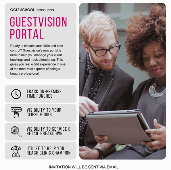 To receive access to the student GuestVision Portal, just ask your school director. They will email you an invitation & then you're IN! You will be able to take control of client bookings, track your attendance & reach your GOALS!!